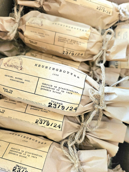 Ons heuning botter is 'n onweerstaanbare kombinasie van romerige plaasbotter en die soetheid van vars, rou plaasheuning met 'n knippie pienk sout. Dit is perfek om te smeer op warm varsgebakte brood, pannekoeke, plaatkoekies en skons. Die natuurlike bestandele en die delikate balans van soet en romerig maak dit 'n bederf wat jy elke dag kan geniet. Heuningbotter is 'n spesiale lekkerny wat elke maaltyd 'n spesiale geur gee.